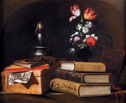 | Nature morte à la chandelle, ouvrage et vase de fleurs sur un entablement de pierre | |