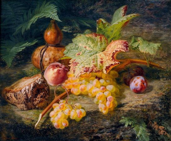 Stillleben mit Weintrauben, Pfirsich und Brot.