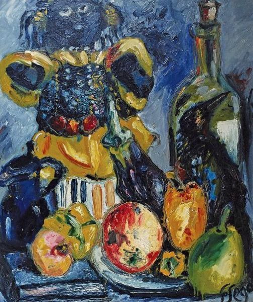 Kompozycja z owocami, butelką i lalką