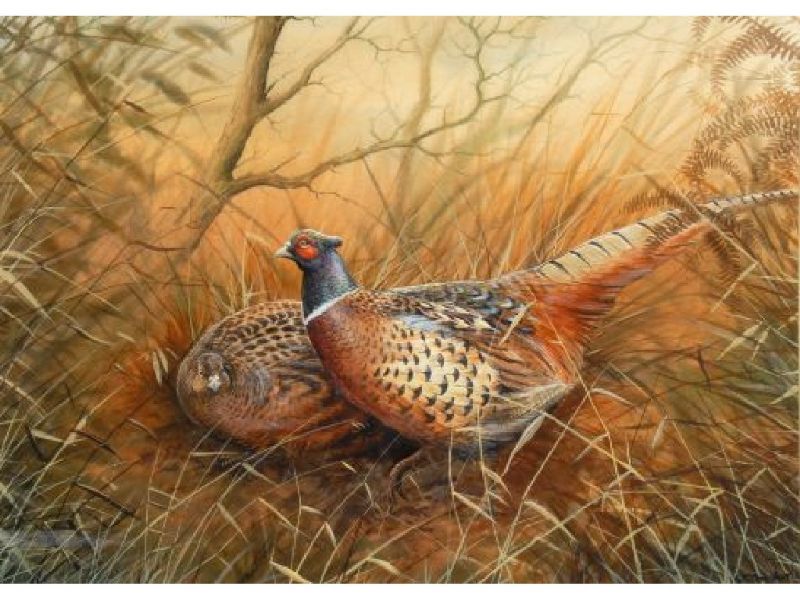 Cock and hen pheasants in cover
