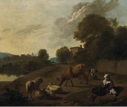 | A River Landscape with Cattle, Sheep and a Young Girl Playing with a Dog | |