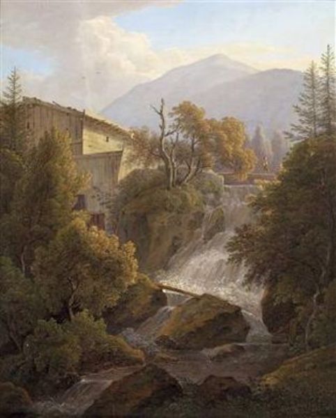 Wehranlage mit Mühle und Wanderer (am Kochelsee?)