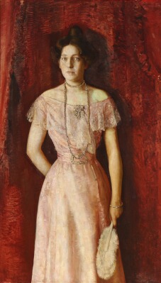 Portrait of a woman in a rose-coloured silk dress and pearl necklace carrying a fan