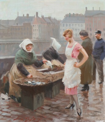 | View from Gammel Strand, Copenhagen, with woman buying fish | |