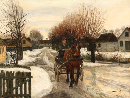 | Winter landscape with a young farmhand driving a horse carriage | |