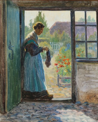 | Woman knitting in a doorway, in the background a blossoming garden | |