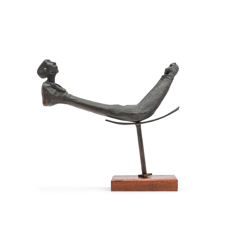 | Bronze with a dark brown and verdigris patina, on a wooden base | |