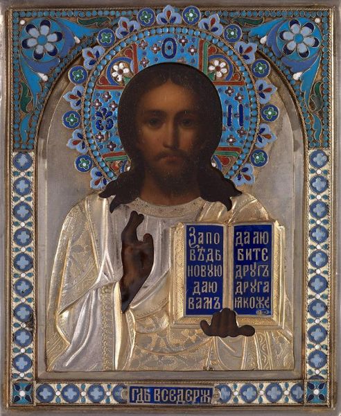 CHRIST PANTOCRATOR WITH AN ENAMELLED OKLAD IN A WOODEN PRESENTATION CASE