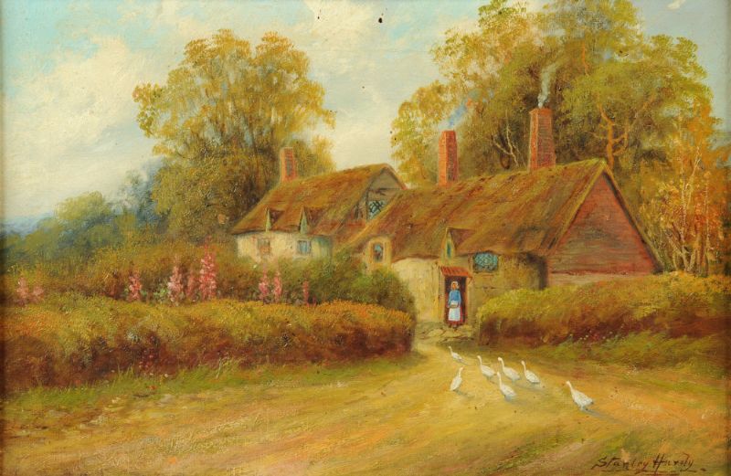 thatched cottage with figure and geese
