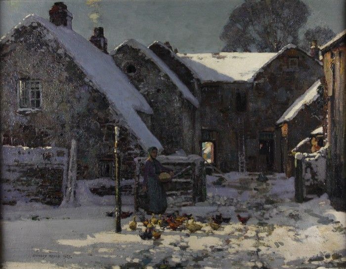 Atmospheric Winter Landscape depicting with woman feeding chicken & geese outside a farm