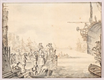 The port of Livorno. Unsigned. Inscribed De la Bella. Drawing ink and wash on paper. Sheet size 235×306 mm. | |