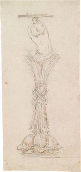 | Design for a table decoration; a salt-cellar (?) in the shape of a child seated on a bundle of straw | |