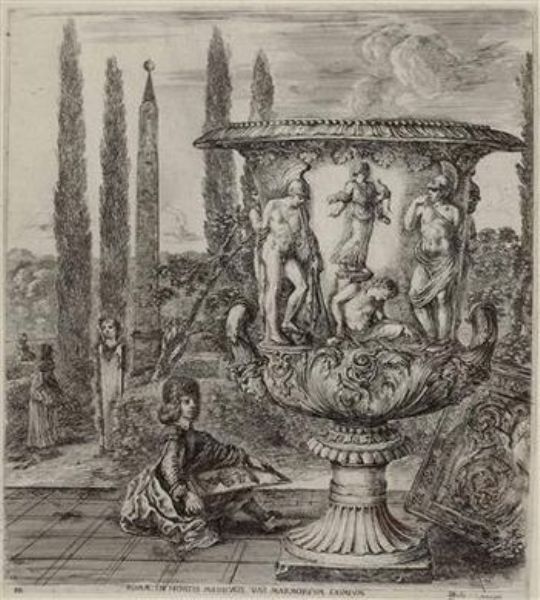 Ein riesiges Marmorgefäß in den Medici-Gärten in Rom, darunter junger Maler