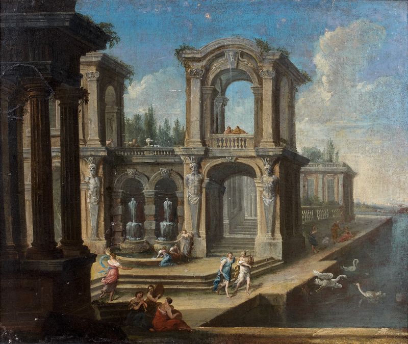 | « Caprices architecturaux : Femmes se reposant au bord d'un bassin devant un palais classique ». - « Cygnes dans un bassin devan | |