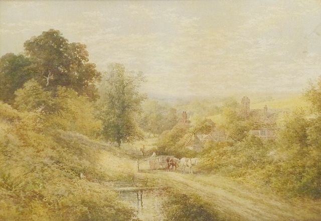 Rural landscape with figures loading a horse-drawn wagon