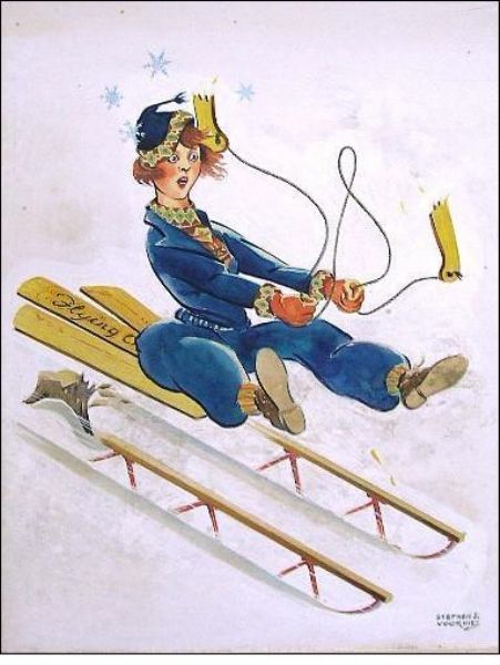 | woman descending a hill on a sled that is falling apart having just collided with a tree stump | |