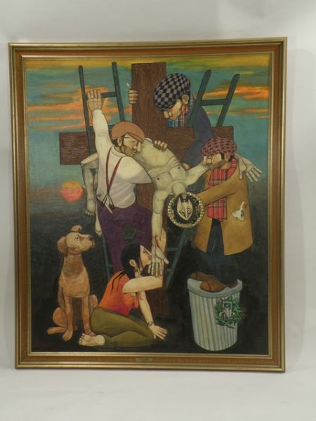 | Descent from the Cross, a modern interpretation with three workmen like figures wearing flat caps and up ladders removing the bo | |