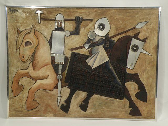 Two Medieval Knights in combat on horse back, possibly an excerpt from The Bayeaux Tapestry stylised
