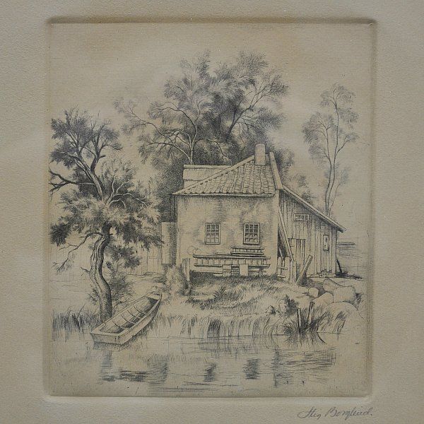 Hus vid sjö. A tergo i blyerts "köpt 14/12 -75 kr. 750 UK."