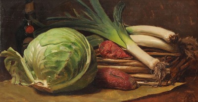 Still life with cabbage, beets, leeks and a bottle of brandy