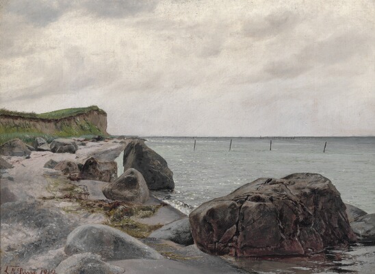 | Strandparti ved Enø med store sten i forgrunden. I baggrunden vandet. Lys himmel med lette skyer | |