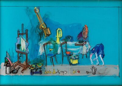 | Gouache colored chalks, pastel on turquoise blue paper | |