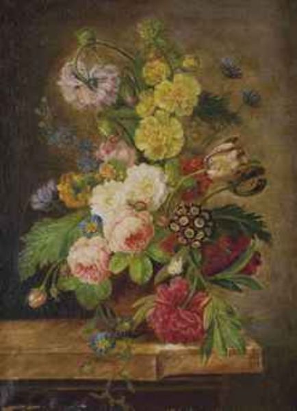 | Vase avec pivoines, roses et tulipes, liserons et autres fleurs sur un entablement en marbre | |