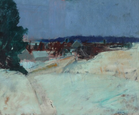 | A wintry landscape with a small town in the background | |