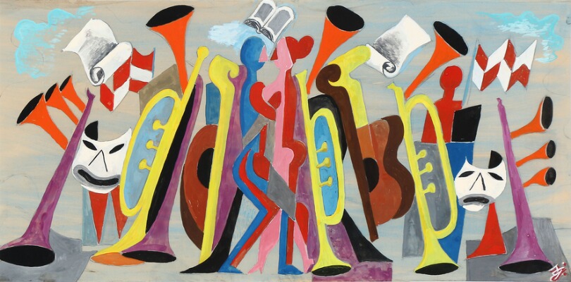 Composition with trompeths and masks