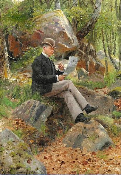 Swedish forest scene with an elegant man reading a newspaper