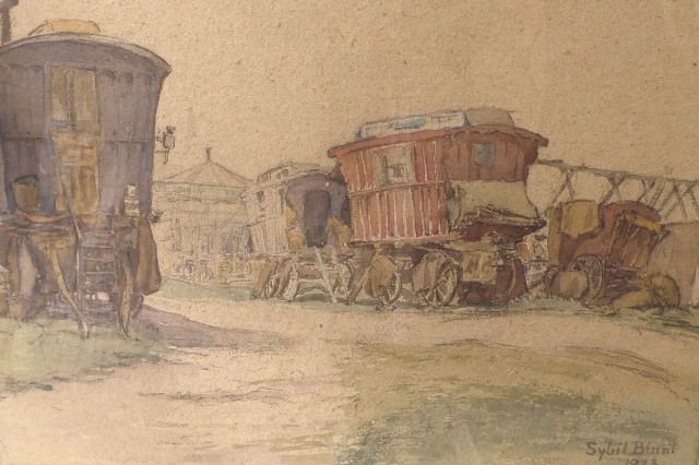 Gypsy caravans with fairground attraction beyond