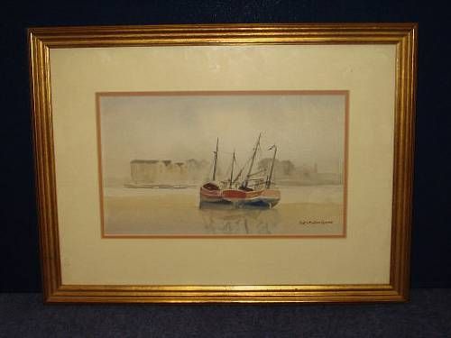 An Estuary Scene, fishing boats to the fore, warehouses beyond