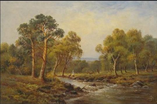 | River landscapes with children fishing beneath tree and cattle watering with mountains in the distance | |