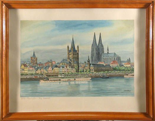 Ansicht von Köln vom Deutzer Ufer aus. Am Ufer ein großer Raddampfer