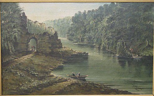 Figures in rowing boat with further figures and ruins on wooded bank in distance
