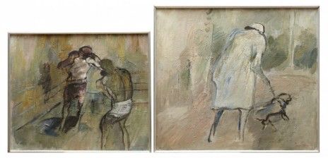 Dam med hund samt motiv från boxningsrinken (2) stycken.