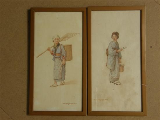 Japanese lady one holding a rake and the other a rose