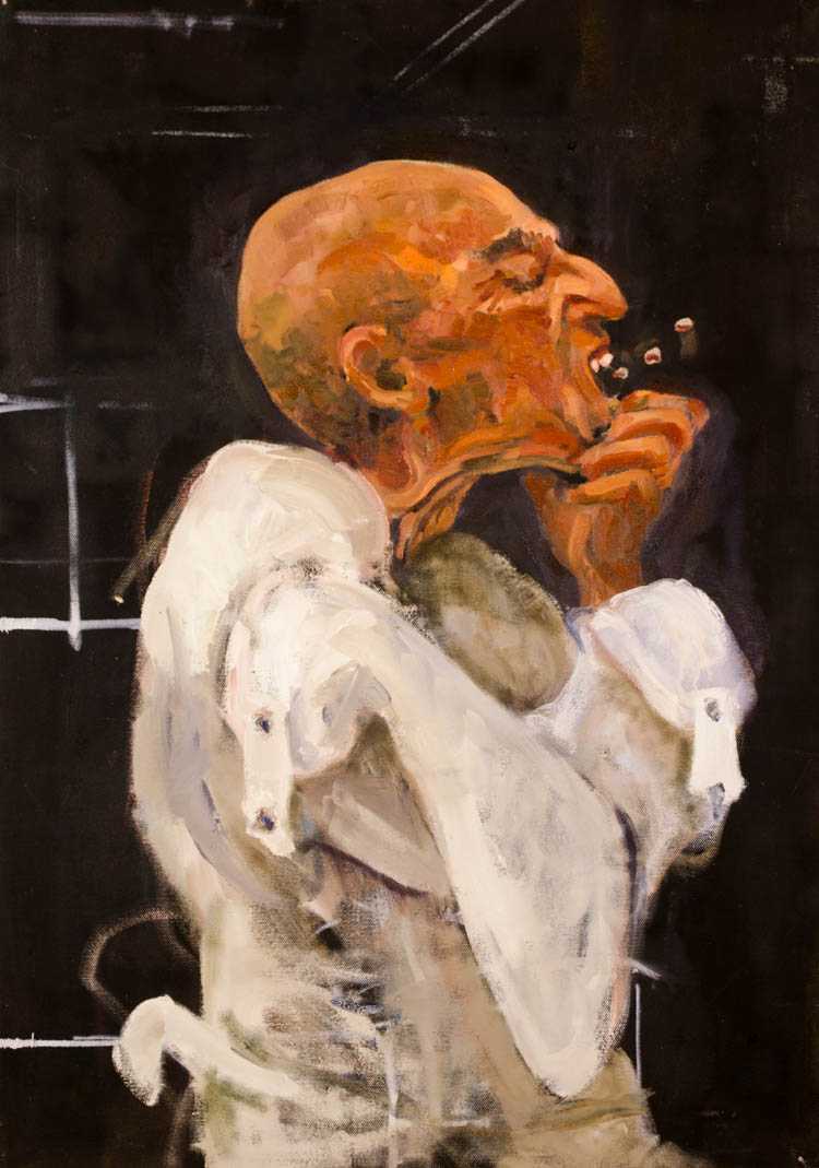 | Untitled, bald man in what looks to be a straightjacket pulling teeth | |