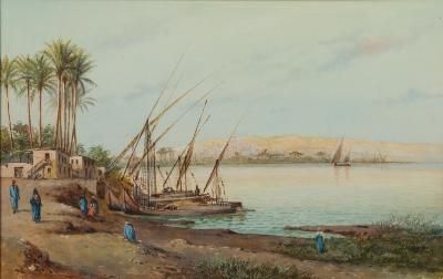 A Nile Scene, Dhows on the River Bank, Figures in the Foreground