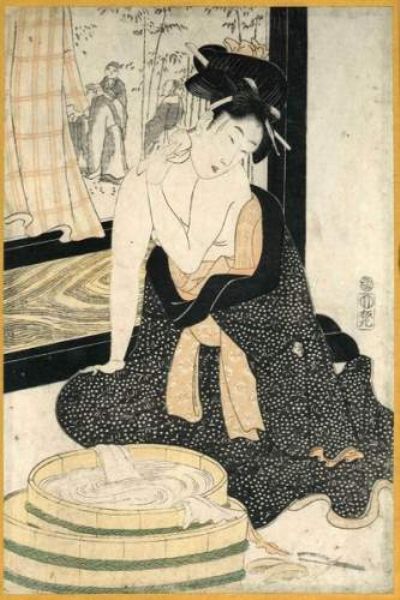 | Oban tate-e, jeune femme se lavant le cou agenouillée devant un baquet. Cachet de censeur kiwame, éditeur Tenjudo. (Légèrement r | |