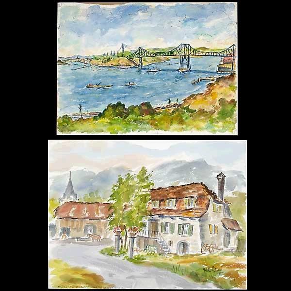 1: Harbor scene with bridge, 2: "Noville Switzerland"