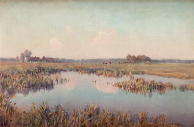 Pejzaż z krowami nad stawem