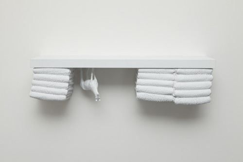 | Sculpture Sculpture comprised of three stacks of white towels (five towels per stack), plastic horse, synthetic hair, acrylic, adhesive and flat household paint on wooden shelf. | |