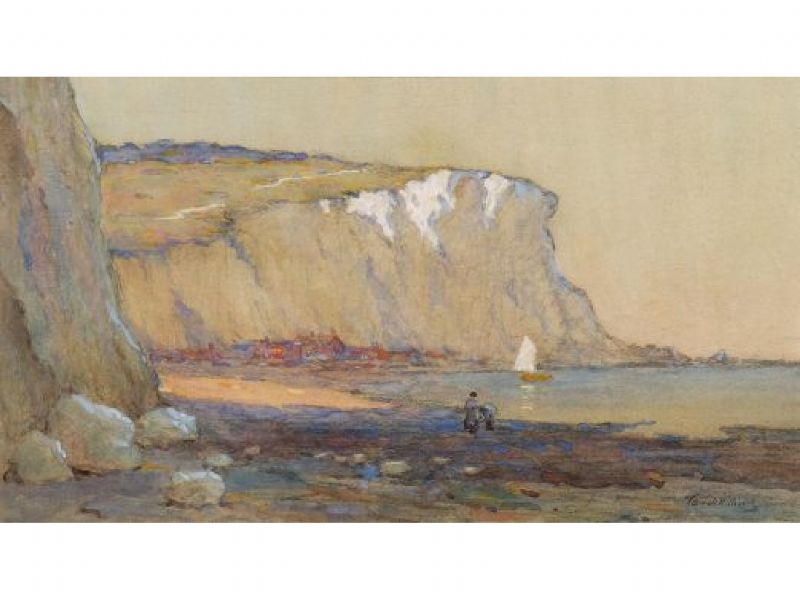 | Chalk cliffs, figures at low tide gathering mussels in the foreground | |
