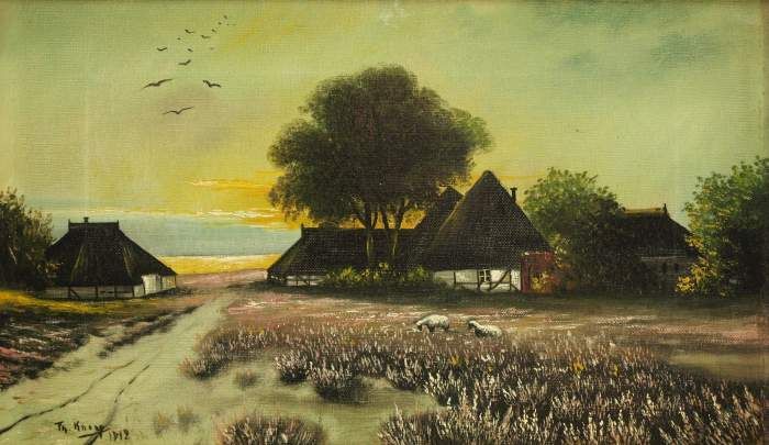 Norddeutsche Landschaft mit reetgedeckten Häusern.