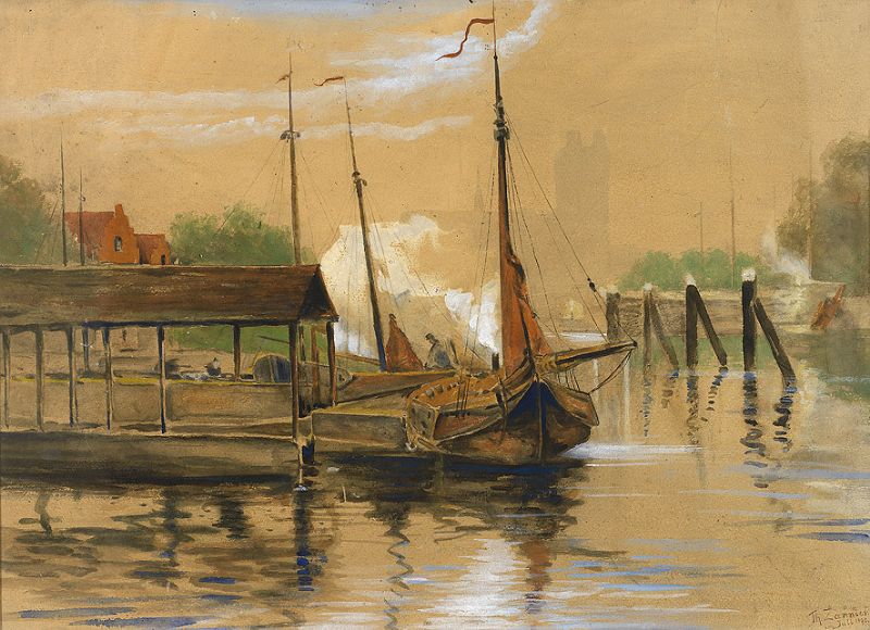 Holländische Kanalansicht mit angelegtem Boot und Architekturstaffage