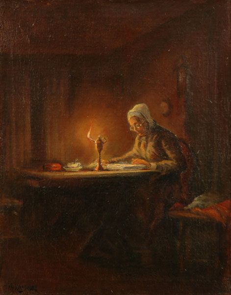 Vrouw lezend bij kaarslicht
