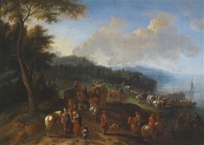 | A coastal landscape populated by horse carriages and numerous figures unloading ships | |
