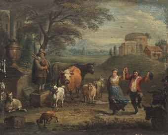 | A landscape with a dancing peasant couple and cattle, classical ruins beyond | |
