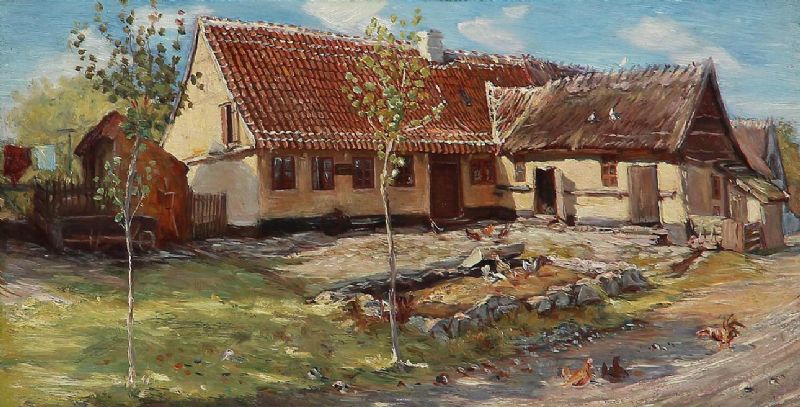 Chicken in front of a farmhouse, presumably Rørvig.